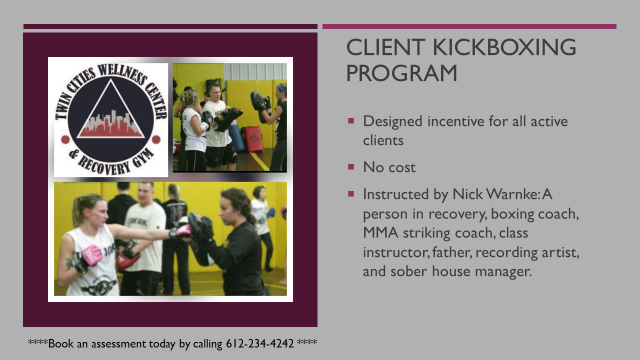 Twin Cities Wellness Center and Recovery Gym (TCWCRG) integrates physical well-being into its services for co-occurring substance use and mental health disorders. TCWCRG provides clients with multiple wellness groups throughout the treatment week in a 3,300 square foot multipurpose gym. Clients are assessed for overall fitness and lifestyle habits/interests and have a mutually agreed wellness plan prepared as a part of a client’s treatment programming and under the direction of a certified physical trainer and ADC. The scheduled participation in group fitness activities is tailored to a client’s individual capabilities. Clients endure physical activity and increase production of endorphins. Clients are exposed to a healthy practice that can help manage their stress levels, develop relationships with their body, and improve their physical health and functionality by focusing on improving mobility, breathing, weight loss, muscle gain and physical endurance enhancing both quality of life while addressing mood disorders such as depression, anxiety, etc.
