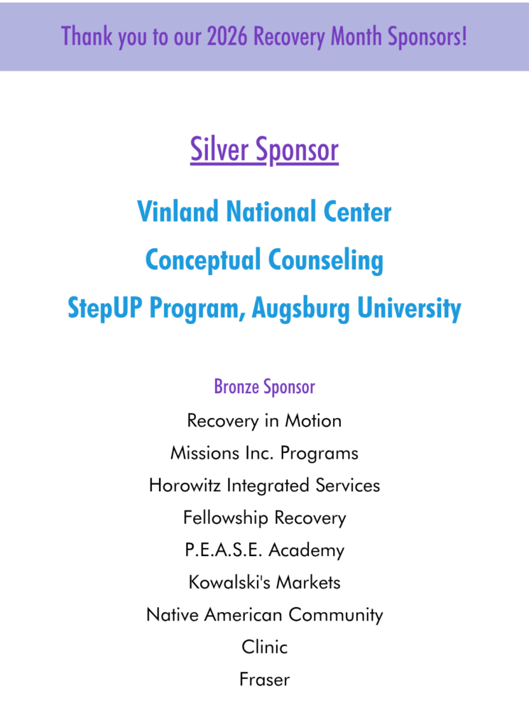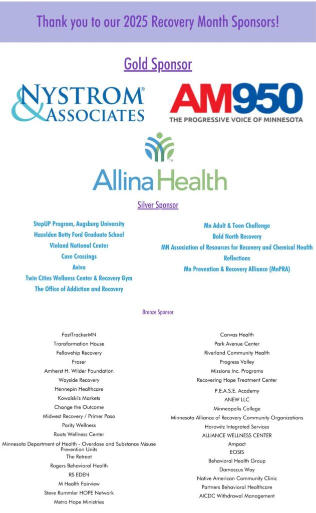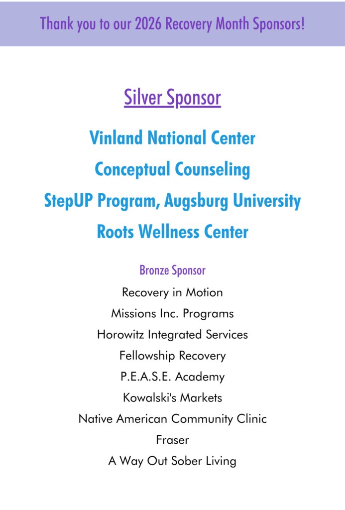By becoming a sponsor of Minnesota Recovery Connection’s 2026 Walk for Recovery, you help raise awareness where there is precious little of it, eliminate the stigma of addiction, and promote the health of our communities.