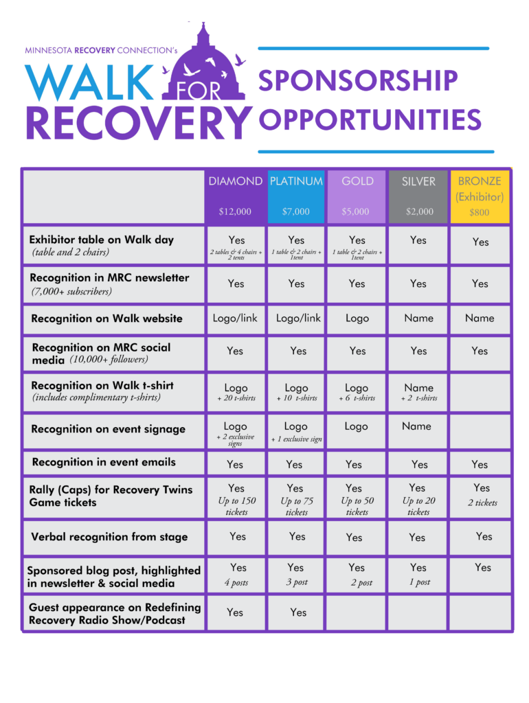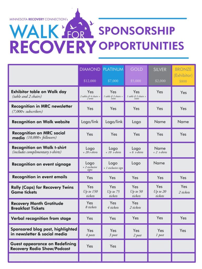 Select from one of the sponsor benefit packages below and register today, or email sponsorship@minnesotarecovery to discuss custom sponsor benefit packages.